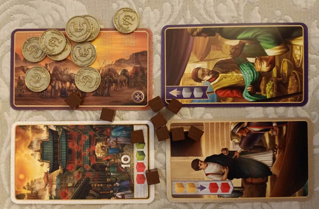 – Carte spezie (di cui ho parlato sopra), per cui il giocatore prende il numero e il tipo di cubi indicati sulla carta dalle scodelle e li colloca sulla propria carta Carovana.