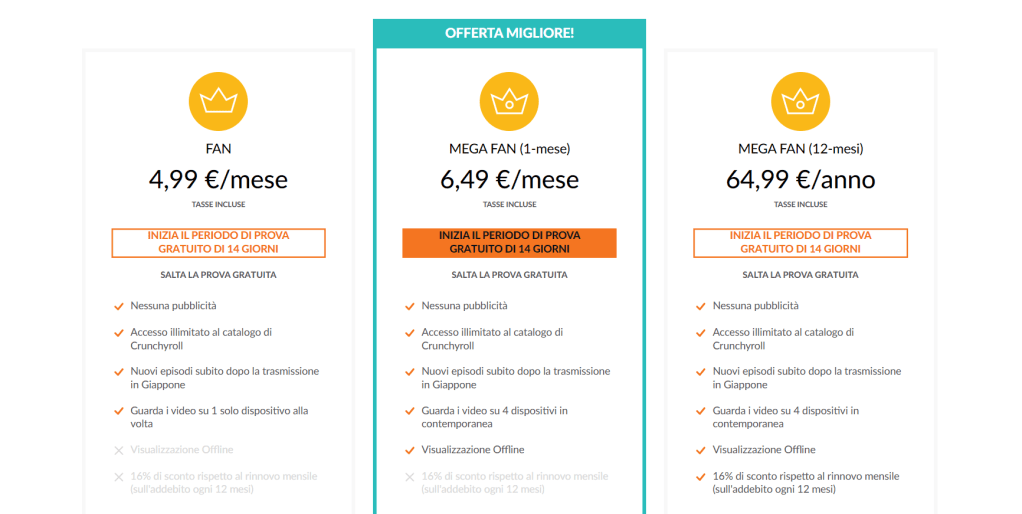 Per chi come me è interessato solamente ad alcuni contenuti, consiglio di attivare la prova gratuita di 14 giorni e guardarli tutti, come ho fatto io. Magari in un periodo dove sai di avere del tempo libero da investire su Crunchyroll. Questo perché, per una piattaforma che ha solo anime, il costo non è poi così basso. Inoltre, Netflix, Amazon Prime Video e altre piattaforme di streaming vantano già centinaia di anime di rilievo nel loro catalogo, quindi Crunchyroll risulta ridondante.