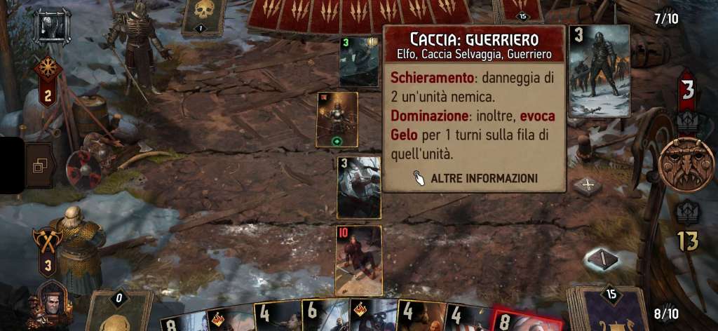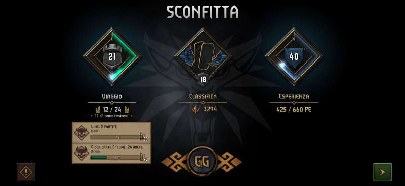 Personalmente gioco con il mazzo Skellige puntando alla distruzione delle truppe avversarie o al loro annullamento. Questo perché, come anticipavo, attualmente mi trovo in una lega con un livello di mazzi superiore al mio e sono costretto a cercare di annullarli per vincere. Attualmente più o meno ne vinco una e ne perdo due. A tal proposito, un’altra cosa che apprezzo di questo gioco, assai differente da altri, è la premiazione della vittoria: una vittoria vale 2/3 sconfitte.